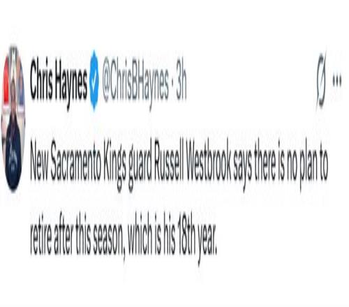 雷速体育10月20日报道宣称 据名记Chris Haynes报道,国王新援卫威斯布鲁克在接受媒体采访时表示,目前并无在本赛季结束后退役的打算。